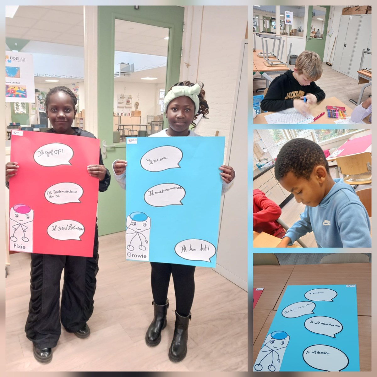 Hier ben ik dan met nieuws uit het Doelab. Vandaag zijn wij gestart met Doelab. Het thema is de leertaal. Onze toppers hebben kennis gemaakt met Growie en Fixie en hebben een collage gemaakt met de uitspraken van Growie en Fixie.