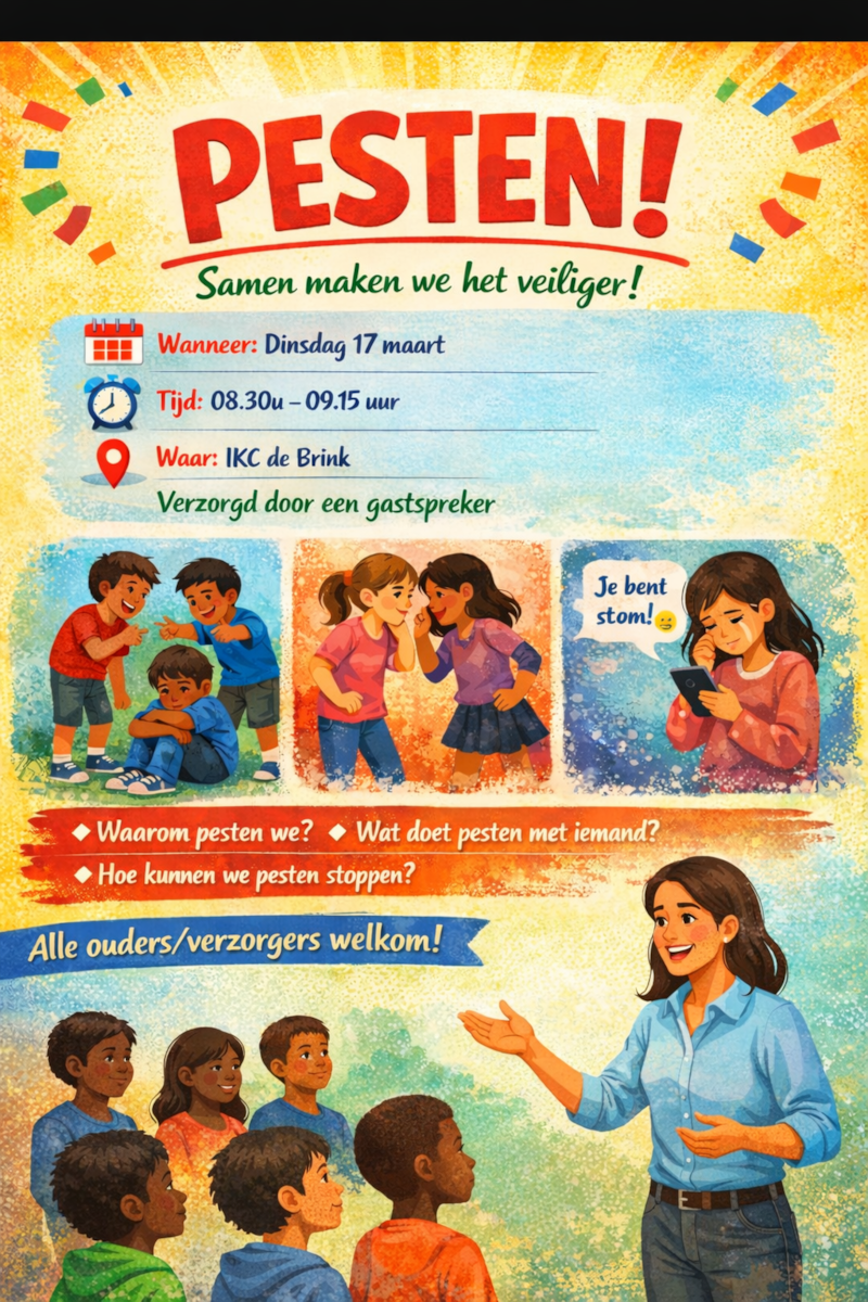 Pesten is een onderwerp dat veel impact kan hebben op het welzijn en de ontwikkeling van kinderen. Op IKC De Brink vinden wij het belangrijk dat ieder kind zich veilig, gezien en gehoord voelt. Daarom organiseren wij een bijeenkomst voor ouders en verzorgers over het onderwerp pesten.
