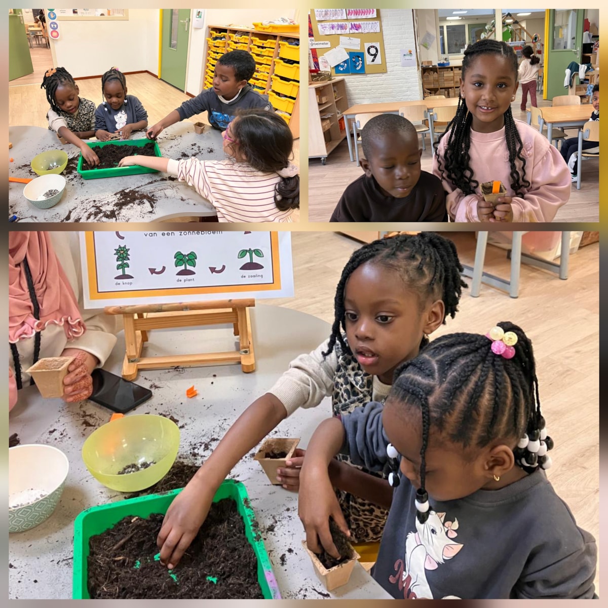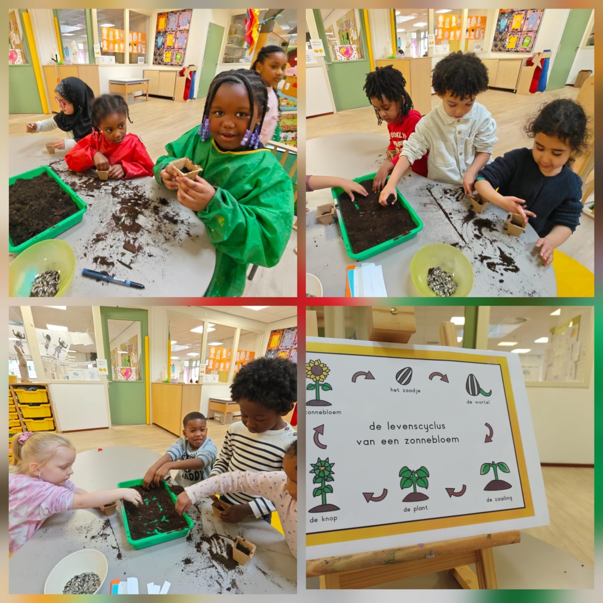 Deze week zijn de kleuters begonnen aan het thema Lente. Ze hebben geleerd hoe een zaadje ontkiemt. Vervolgens mochten ze allemaal een zonnebloemzaadje planten in een potje. Nu maar wachten op de mooie bloemen!